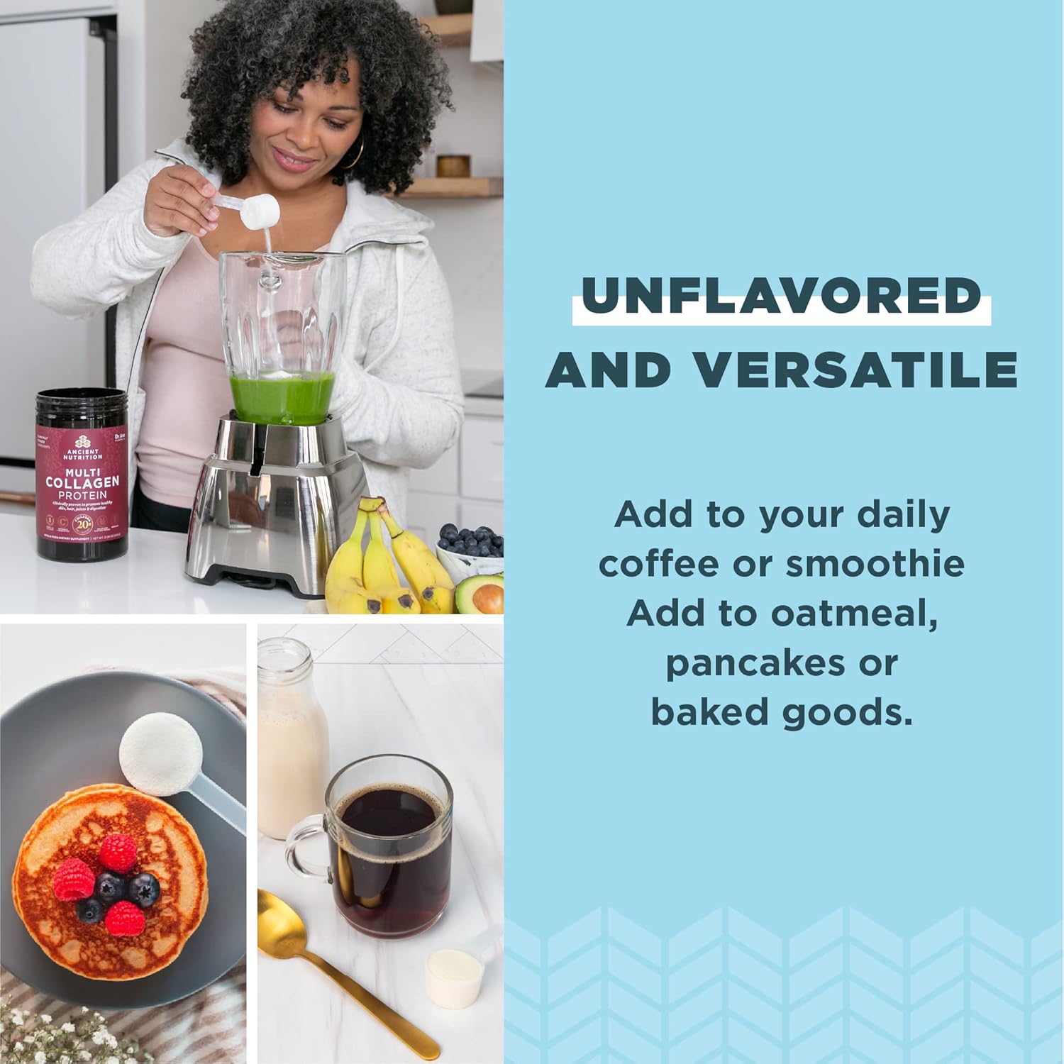 Easy to use – just add 2 scoops to water, smoothie, protein shake or coffee; Mixes easily in hot and cold liquids; Non-GMO, grass-fed, pasture-raised and cage free, made without hormones or chemicals, gluten and grain free.